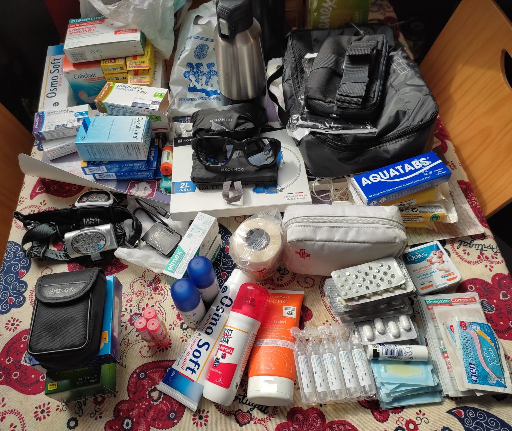 • Le matériel électronique/électrique : Une frontale pour l’ascension finale, et la vie au camp le soir : A la fois sur batterie, et sur piles, elle doit obligatoirement permettre d’émettre un signal LED rouge. J’ai choisi un modèle 600 lumens HL 900 de Forclaz. J’emmène des jumelles compactes, mon téléphone pour les vidéos et photos (avec protection hydrogel sur l’écran et pochette hermétique antifroid & pluie). J’aurais également deux batteries externes de 20000 mAh pour recharger tout ça le soir.